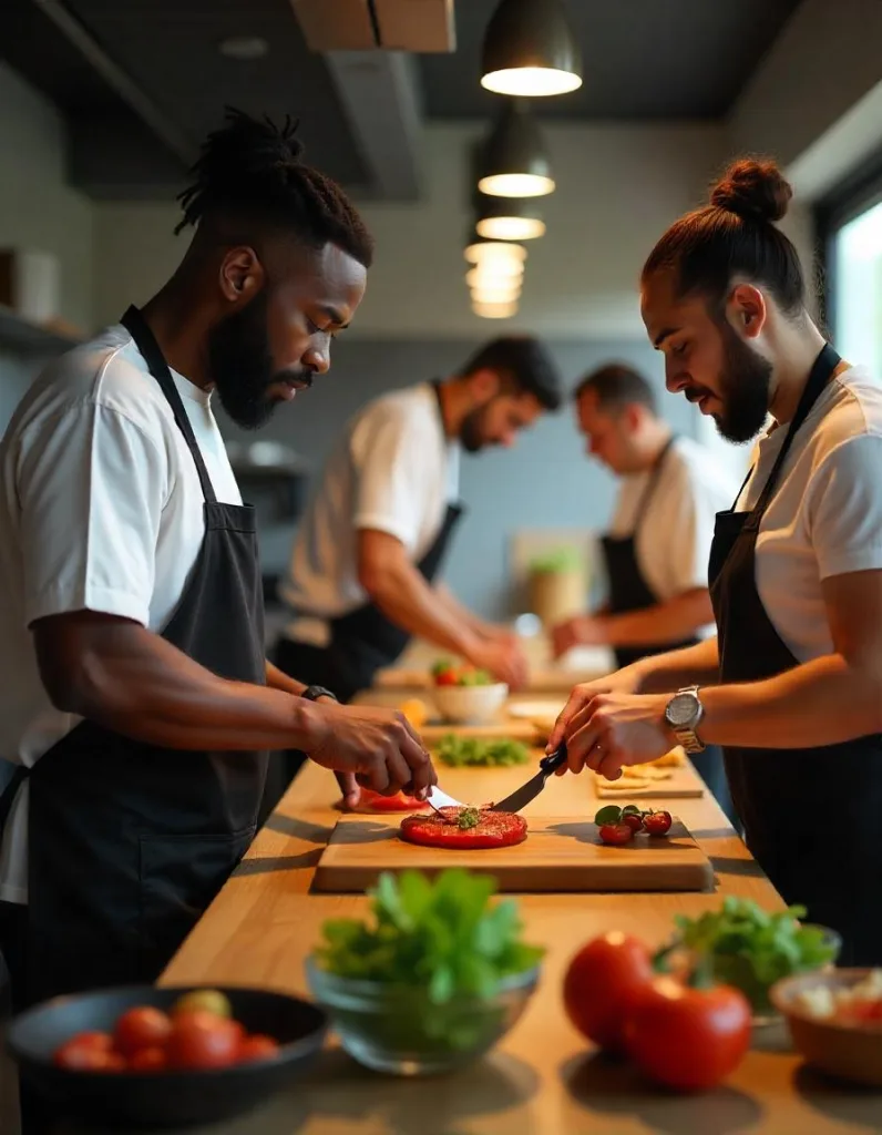 Formação adaptada ao fluxo de trabalho, desde organização, técnicas de preparo, segurança alimentar, controle de tempo e trabalho em equipa.